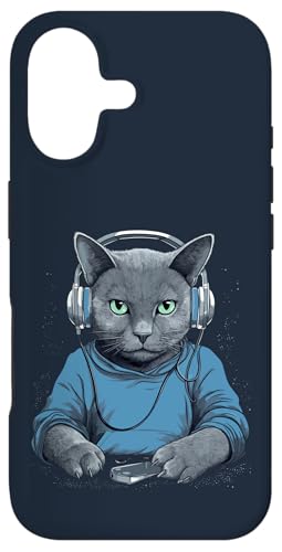 Casque D'écoute Musicien Chat Bleu Russe Chat Gamer Chats Coque pour iPhone 16
