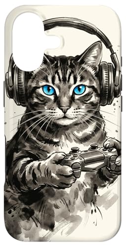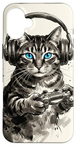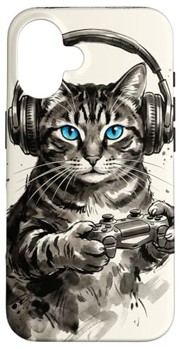 Gamer Cat Chat Japonais Chaton tigré avec Casque Nerd Coque pour iPhone 16 Plus