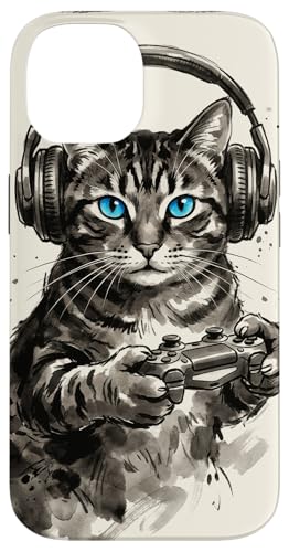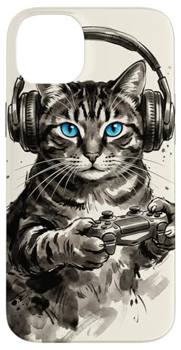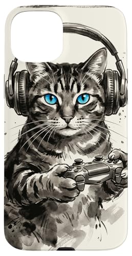 Gamer Cat Chat Japonais Chaton tigré avec Casque Nerd Coque pour iPhone 15 Plus