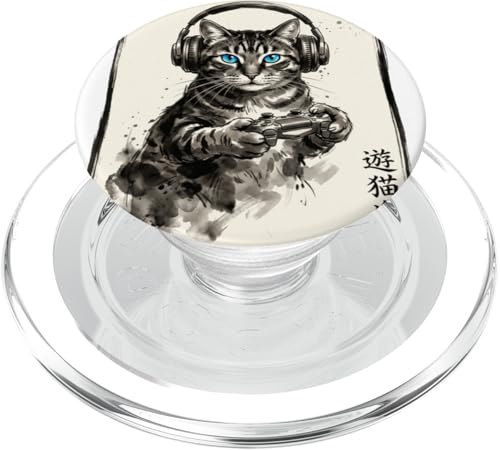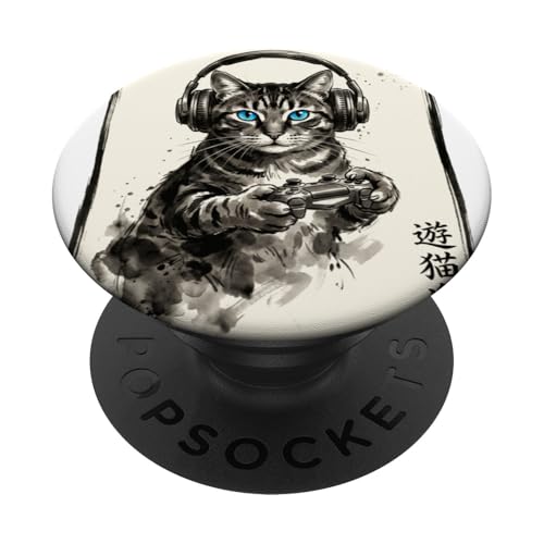 Gamer Cat Chat Japonais Chaton tigré avec Casque Nerd PopSockets PopGrip Adhésif