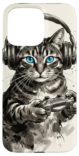 Gamer Cat Chat Japonais Chaton tigré avec Casque Nerd Coque pour iPhone 15 Pro