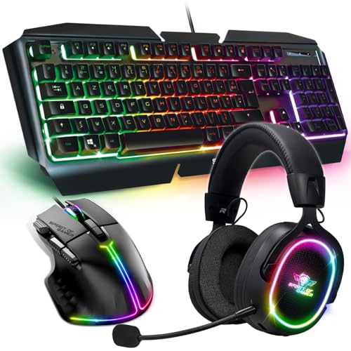 Spirit Of Gamer, Pack Clavier Souris Gamer RGB + Casque, Clavier AERTY 19 Anti-Ghosting, Souris 12800 DPI avec 8 Boutons Programmables, Casque Gaming avec Micro Son Stéréo 2.0