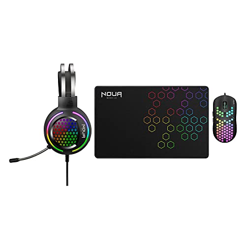 Noua Uranus Combo Pack de Jeu 3 en 1 – Souris Gaming 7200 DPI [6 Niveaux réglables], Casque de Jeu 50 mm USB/Jack 3,5 mm, Tapis de Souris antidérapant – Compatible avec PC/PS4/Xbox One