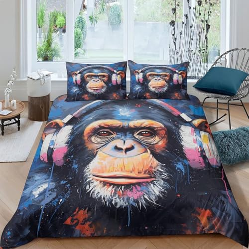 UNRXJZLVM Singes Casque Musical 3D Imprimé Housse de Couette Microfibre Décoration Chambre Parure de Lit Animal Douceur Respirante Single(135x200cm)