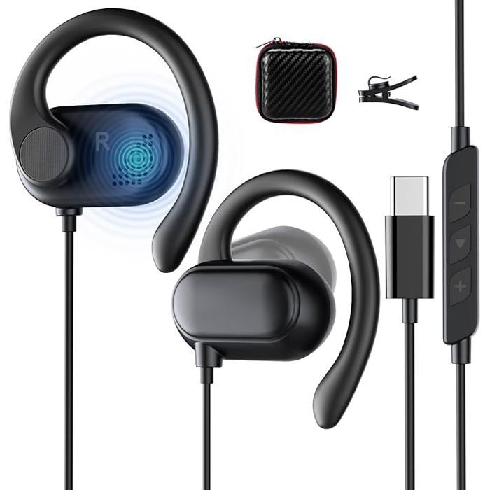 Écouteurs USB C pour iPhone 16 Plus, Samsung Z Flip Fold 6 A35 S24 Ultra S23 Pixel 8 7 Casque à oreilles ouvertes Type USB-C Écouteurs de sport avec microphone Contrôle du volume Crochet d'oreille