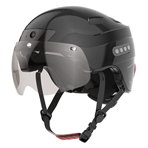 Casque de vélo Adulte Casque Intelligent Bluetooth avec enregistreur de Conduite et Fonction de feu arrière à LED pour visière détachable pour Banlieue Urbaine pour Hommes (Motif Fibre Plus)