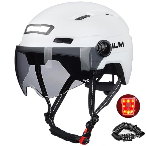 ILM Casque Velo VTT Homme Femme Casques de Cyclisme Adulte Visiere avec Cadenas Lumière LED Avant et Arrière Rechargeables par USB E3-10L,Blanc,S/M