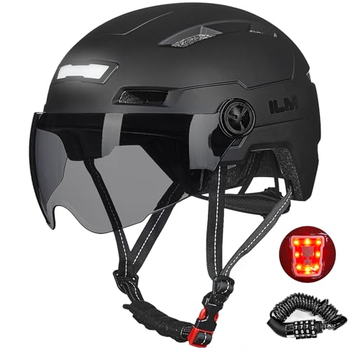 ILM Casque Velo VTT Homme Femme Casques de Cyclisme Adulte Visiere avec Cadenas Lumière LED Avant et Arrière Rechargeables par USB E3-10L,Noir Mat,S/M