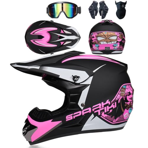 SMTSEC Casque De Moto pour Jeunes Casque De Motocross Adultes Enfants Casques De Cross Casque De Moto Enduro Casque VTT Intégral Certifié Dot avec Lunettes Masque Gants Casque De Descente,Pink/C-S