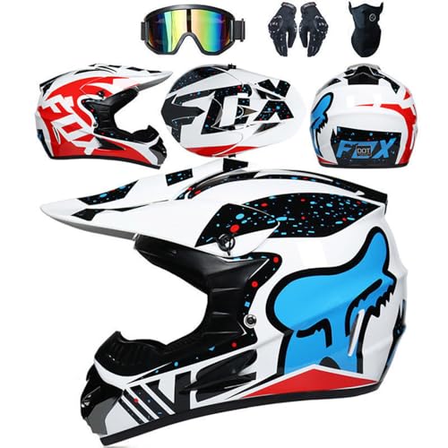 SMTSEC Casque De Moto pour Jeunes Casque De Motocross Adultes Enfants Casques De Cross Casque De Moto Enduro Casque VTT Intégral Certifié Dot avec Lunettes Masque Gants Casque De Descente,White/B-L