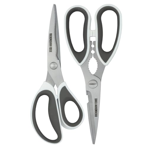 Rockingham Forge Lot de 2 ciseaux de cuisine et de ménage, résistants à la rouille, lames incurvées et pliées en acier inoxydable de 9 cm, casse-noix et décapsuleur, blanc et gris