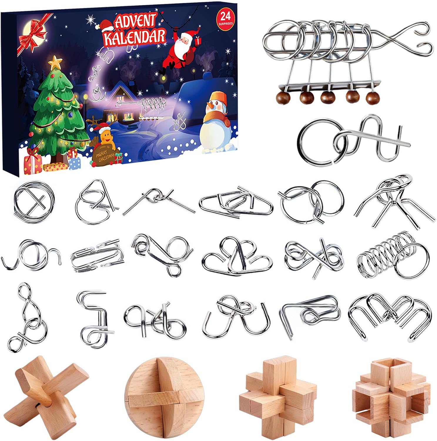 JEXNOVASHOP-Calendrier de l'Avent 2025 Enfants, Calendrier de l'Avent Casse Tete Puzzle, Calendrier Noël Compte à Rebours 24 Pièces Puzzles Métal Casse-Tête Bois Jeux d'Adresse Puzzle 3D Garçons Fill