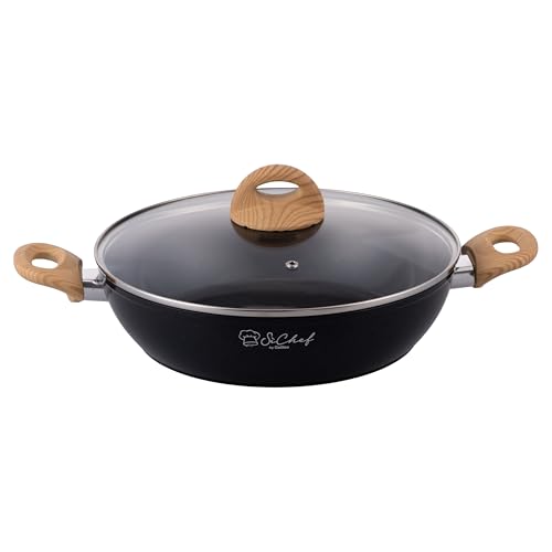 MasterChef Casserole Tout Feux, Induction, Gaz, Céramique et Plus, Anti-adhésive, Revêtement Anti-Dérapant, Poignées au Toucher Doux, Couvercle en Verre, 24cm, Aspect Bois