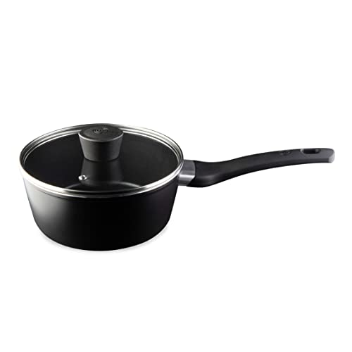 MasterChef Casserole Tout Feux, Induction, Gaz, Céramique et Plus, Anti-adhésive, Revêtement Anti-Dérapant, Poignée Ergonomique, Couvercle en Verre, 18cm, Noir