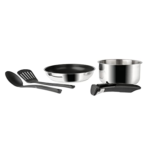 Batterie 5 pièces Inox - ARPEGE - 1 Casserole ø18 cm Inox, 1 Poêle ø24 cm revêtu + 1 Spatule Nylon, 1 Cuillère Nylon, 1 poignée Sitramovible - Tous feux DONT induction