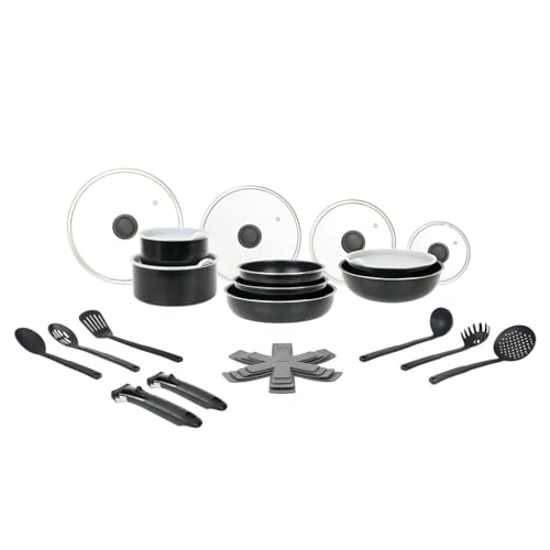 QDESIGN DIAMOND Batterie de cuisine 10 pcs - casseroles+poêles+couvercles+poignée amovible| Alu antiadhésif renforcé diamants- tous feux, induction - Compatible lave-vaiselle- Noir diamant, Empilables