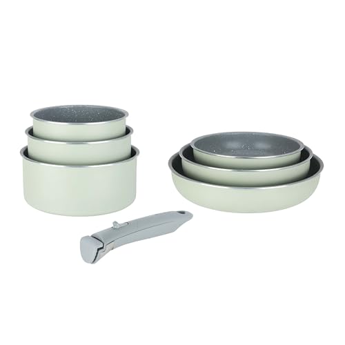 Sitram 716939 Batterie de Cuisine 7 pcs Alu Pressé Vert + Revêtement Céramique sain Sans PFAS – 3 poêles Ø20/24/28cm + 3 casseroles Ø16/18/20cm + Manche Amovible - Tous feux dont induction