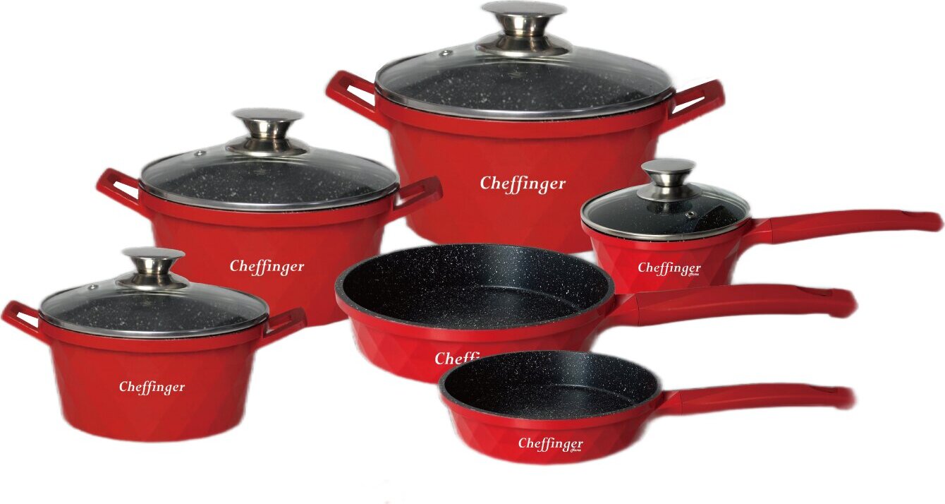 set de 12 casseroles à induction Diamant Casserole Induction Alu Fonte Couvercle Gants Rouge