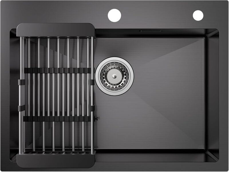 CECIPA max Évier de Cuisine Noir Anthracite 60 x 45 cm, Évier Carré en Acier Inox 201 avec Égouttoir et Siphon, 2 Trous de Robinetterie, Cuve Simple à Encastrer
