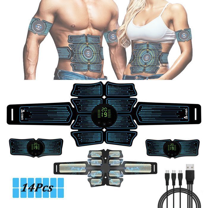 Electrostimulateur musculaire haute gamme | ceinture abdominale electrostimulation - KIT EMS complet : Abdos + Electrodes Fessiers, Bras, Cou/Nuque, 8 Modes,14 niveaux- Appareil Fitness rechargeable