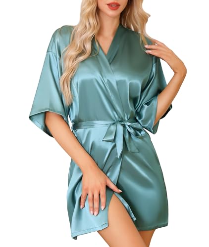 Lovasy Peignoir Satin Femme Mariage Peignoir en Soie Court Kimono Bride Femme Sexy Léger Col V avec Ceinture Robe de Demoiselle d'Honneur Robe de Chambre Gris vert M