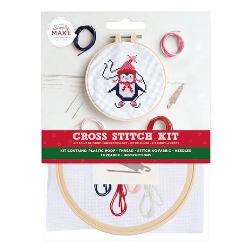 Simply Make Kit de broderie au point de croix – Motif pingouin pour enfants et adultes, avec cerceau, fil à broder, tissu et aiguille – Parfait pour les travaux manuels pour adultes et les débutants –