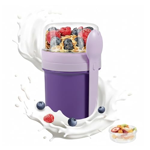 Muesli Cup, 450 ml + 250 ml, Tasse à Yaourt, tasse de céréales à emporter étanche avec cuillère et boîte à sauce, boîte à déjeuner sans BPA, bol à céréales, pour les enfants et les adultes, pourpre