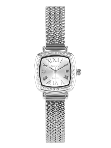 JSDDE Petite Montre pour Femme avec Bracelet en Acier Inoxydable, Montres Analogique Quartz Cadran Carré Chiffres Romains, Montre Fantaisie Poignet Bracelet Maille Palmier Chaîne Spiga (Argent)