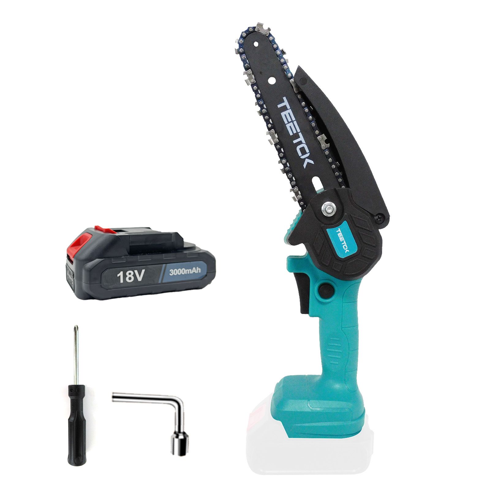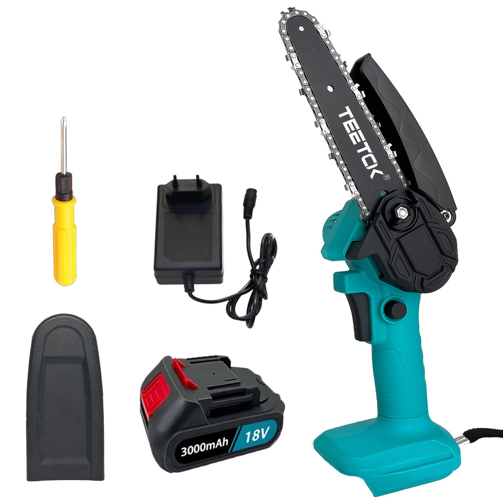 TEETOK scies à chaîne Mini tronçonneuse 6-pouces sans fil 21V électriques,avec 18V batterie 3.0Ah+chargeur,pour Domestique Jardinage Verger Cueillette Elagueurs bois coupés DIY Outil,Compatible Makita