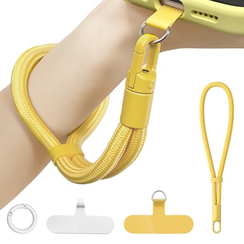 Bellanova Dragonne Telephone Portable pour téléphone Portable, Chaine Telephone Portable en Cordon Anti-Perte, avec Patch Ultra Fin, Chaîne Courte réglable pour Coques, clés (Jaune)
