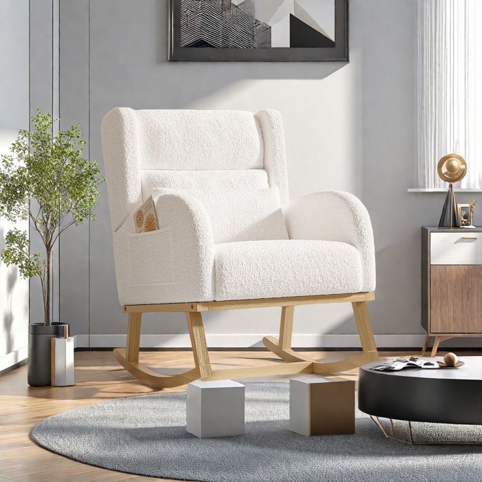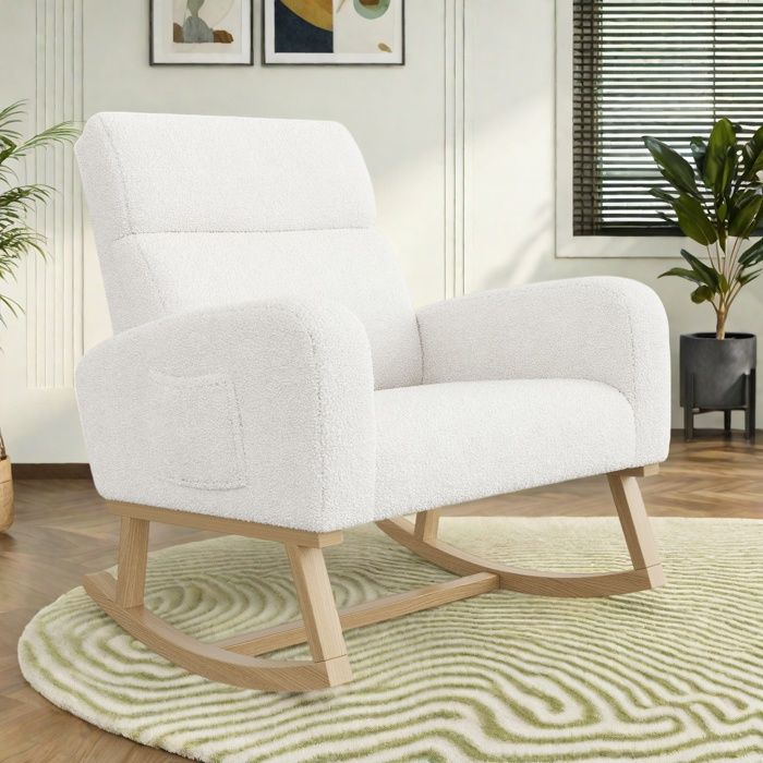 Fauteuil à bascule en velours blanc avec accoudoirs et poche latérale – chaise relax moderne pour salon ou allaitement