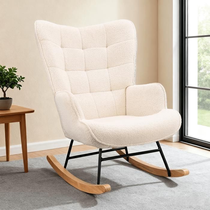 Fauteuil à BasculeChaise a Bascule AllaitementRocking ChairPieds en Bois MassifVelours TeddyStyle Scandinave Blanc