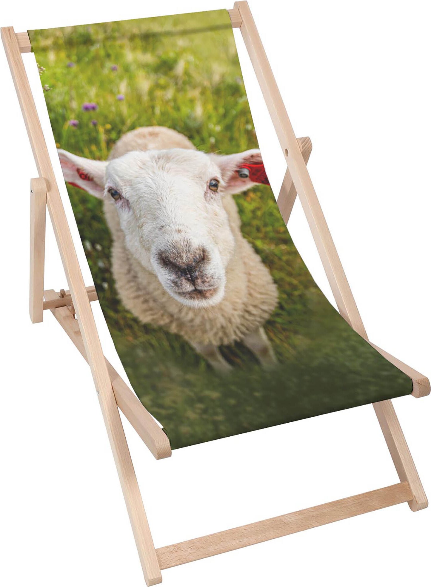 Dreamroots Chaise longue pliante bois, bois de hêtre jusqu'à 130 kg, Chaise longue pliante avec réglage de l'inclinaison du dossier en 3 positions, Friendly Sheep