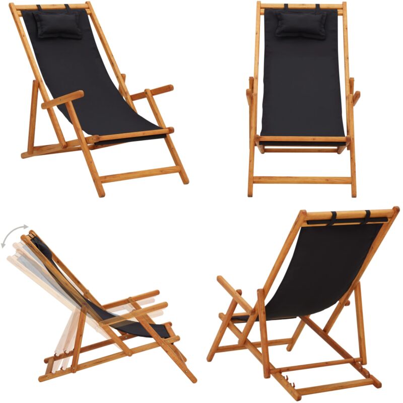Vidaxl - Chaise pliable de plage bois d'eucalyptus solide et tissu noir - Chaises De Jardin - Chaises De Plage - Mobilier De Jardin - Chaise Pliante