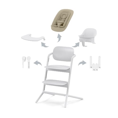CYBEX Gold LEMO Set Chaise Haute 4en1, évolutive, 0 - 99 ans, Peut être utilisé dès la naissance ; Inclus Nid de transat, Set pour bébé, Plateau de collation, Réducteur nouveau-né, Appui-tête et Set Adaptateurs : Aluminium / Plastique ; All White