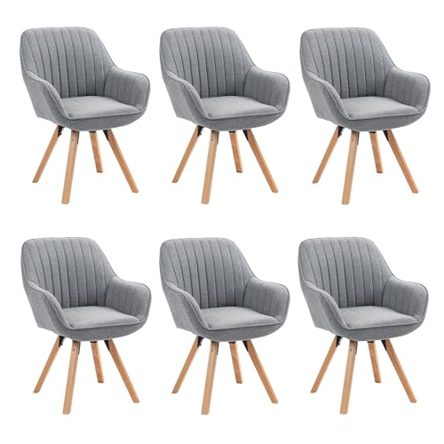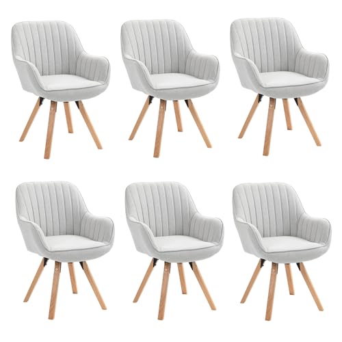 Meuble Cosy Lot de 6 Chaise Salle à Manger Scandinave Fauteuil Coiffeuse Siège Pivotant avec Accoudoirs pour Chambre Salon Cuisine Bureau, Rembourré en Tissu Pieds en Bois Massif, Gris, 60x58x83cm