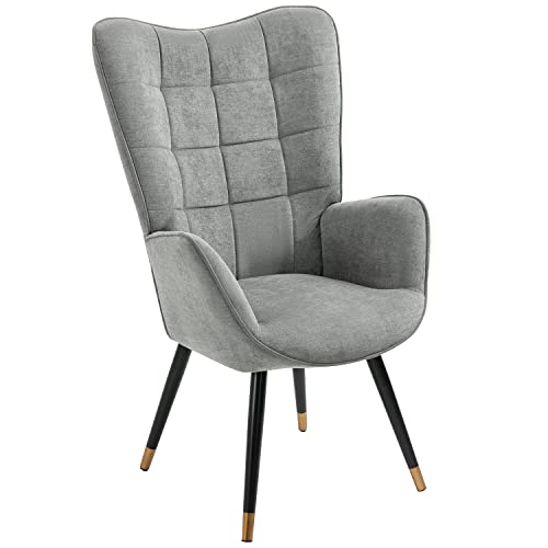 MEUBLE COSY Fauteuil Salon Scandinave Confortable Chaise de Coiffeuse Canapé pour Chambre Salle à Manger Bureau Allaitement avec Assise Épais Accoudoirs Rembourés en Tissu Pieds Bois Massif, Gris