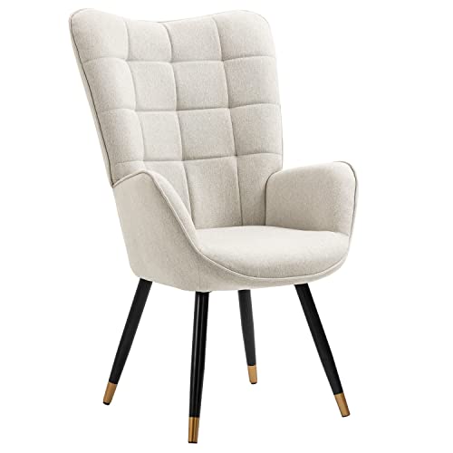 MEUBLE COSY Fauteuil Salon Scandinave Confortable Chaise de Coiffeuse Canapé pour Chambre Salle à Manger Bureau Allaitement avec Assise Épais Accoudoirs Rembourés en Tissu Pieds Bois Massif, Beige