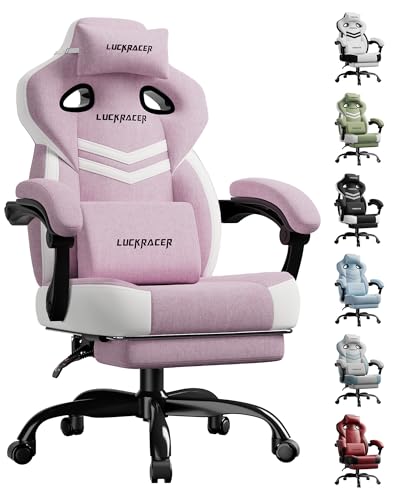 LUCKRACER Chaise de Gaming en Tissu avec accoudoirs connectés, Coussin en Mousse à mémoire de Forme, Angle d'inclinaison de 90 à 155 ° et Repose-Pieds, Tissu Fonctionnel résistant, Rose