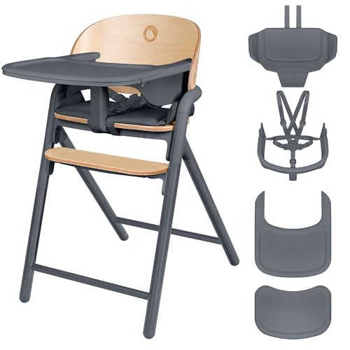 LIONELO Celia Chaise Haute en Bois, Évolutive, dès 6 mois jusqu'à 90 kg, Repose-pieds Réglable, Harnais 5 Points, Coussin de Siège, Nettoyage Facile
