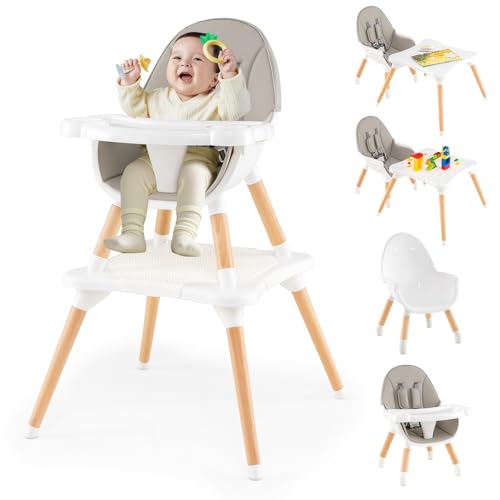 COSTWAY 6 en 1 Chaise Haute Bébé Evolutive, Table en Blocs Convertible, Harnais à 5 Points, Plateau Réglable Amovible, Chaise Haute Bebe en Bois, pour 6-36 Mois, Charge 15 kg, Gris