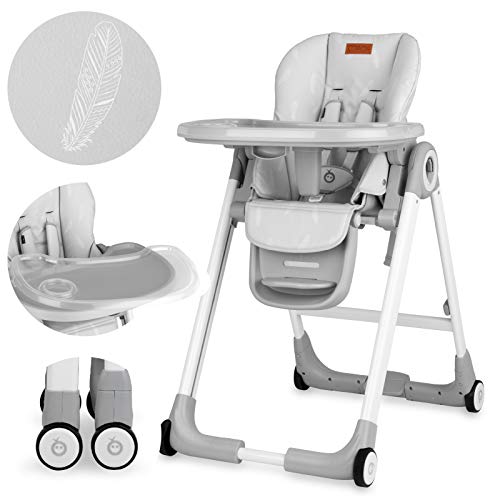 Chaise haute MoMi LUXURIA à 4 roues avec fonction de freinage, harnais de sécurité 5 points, pliable, réglable en hauteur (7 positions), dossier réglable (5 positions) et plateau (2 positions)