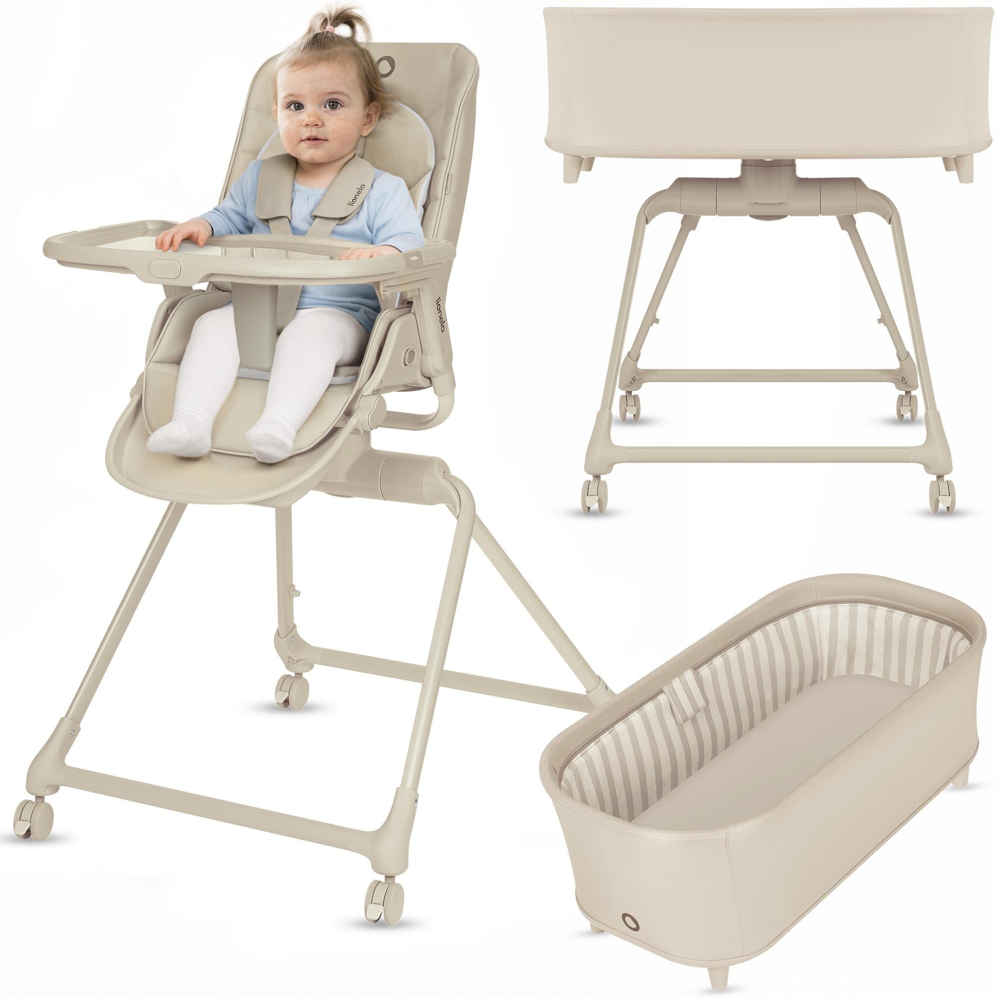 Ensemble 3 en 1 Lionelo : chaise haute, transat et lit bébé Maddie, 0 à 36 mois, pivotant à 360° avec roulettes - Beige