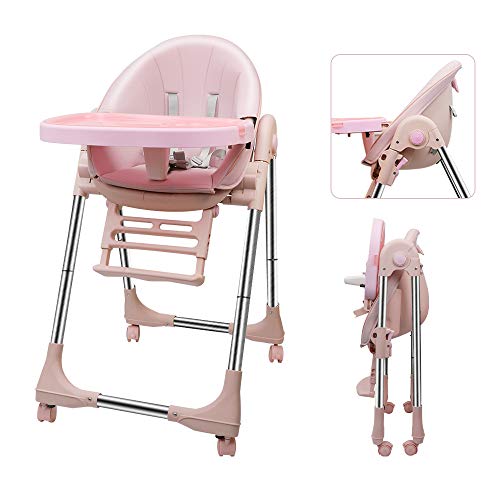 OUNUO Chaise Haute Enfant, Chaise Haute Bébé Evolutive, Pliable, Réglable, Nettoyage facile, Avec Roulettes (Rose)