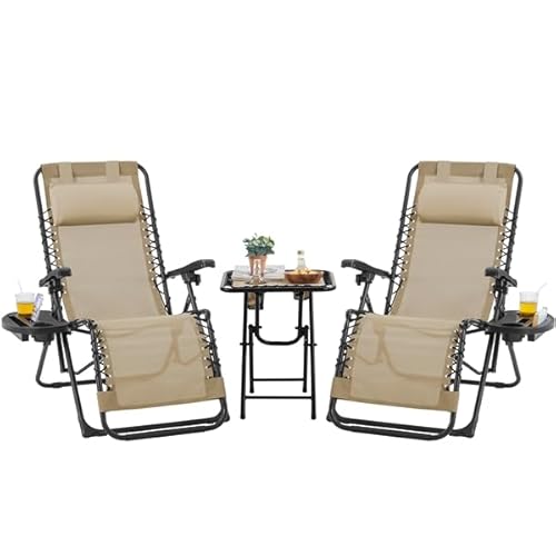 Yaheetech Lot de 2 Chaise Longue inclinable, avec Table Pliable Support de Gobelet, Chaise de Jardin Pliable en Textilène Chaise Longue, avec Rembourrage de Tête, Beige (Beige)
