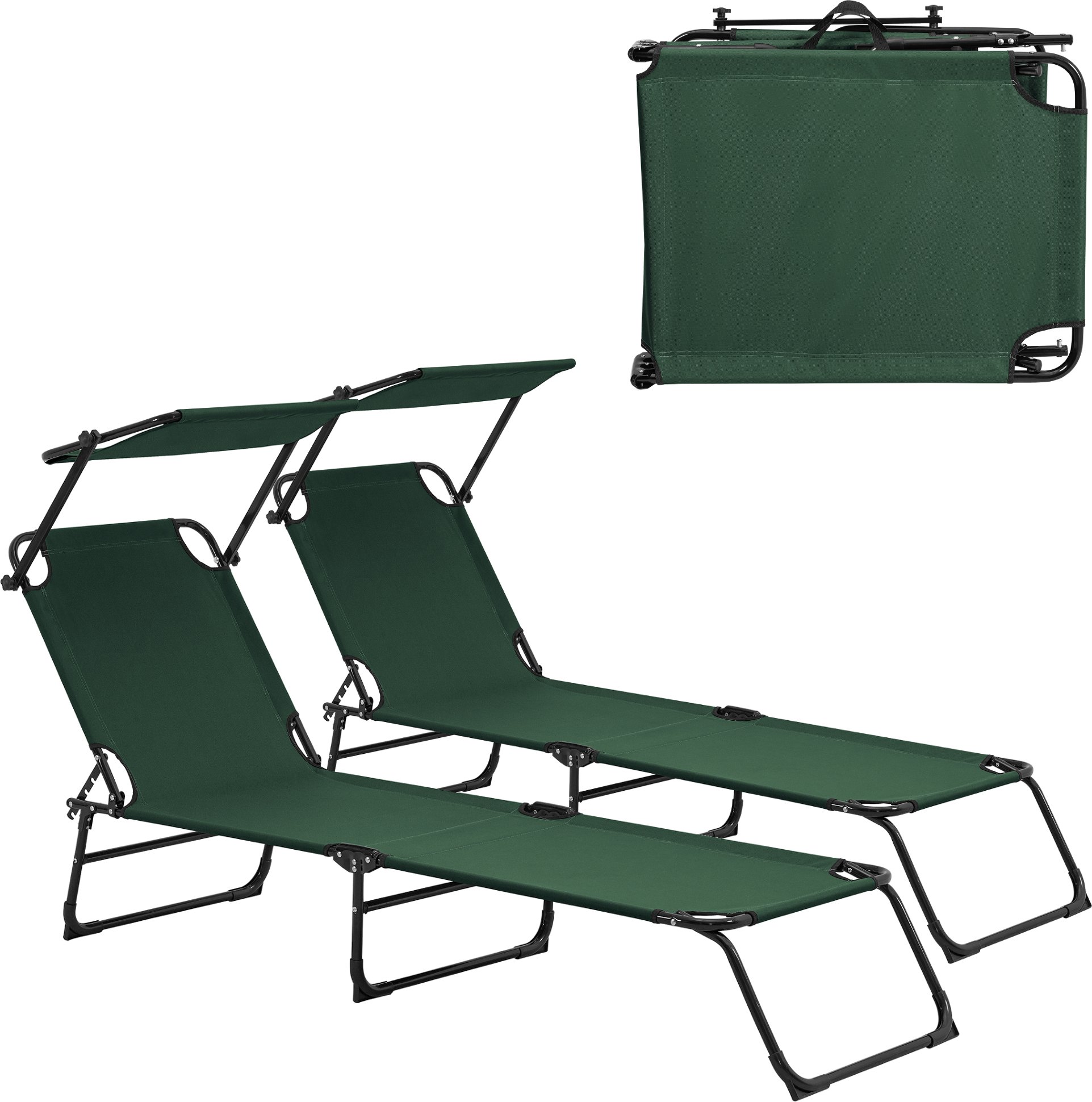 [casa.pro] Chaise longue [set de 2] pliable 190cm vert foncé avec toit Chaise longue de relaxation acier