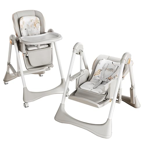 Veitoalioy Mode Repas 2 en 1 et mode Swing, Chaise Haute pour Bébé Chaise de Salle à Manger, Avec Doubles Plateaux et Roulettes Amovibles, Multifonctionnelle Pliable Convertible (8121 Grey)