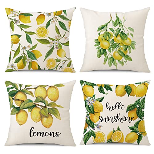 OCEUMACO Housse de Coussin 45x45 Motif Citron Décoratif Housses Coussins pour Canapé Lit Chaise Salon Lot de 4 Vintage Feuille Taie d'oreiller Carré en Lin Scandinave - Jaune Vert