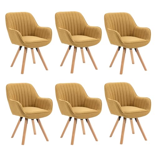 MEUBLE COSY Lot de 6 Chaise Salle à Manger Scandinave Fauteuil Coiffeuse Siège Pivotant avec Accoudoirs pour Chambre Salon Cuisine Bureau, Rembourré en Tissu Pieds en Bois Massif, Jaune, 60x58x83cm