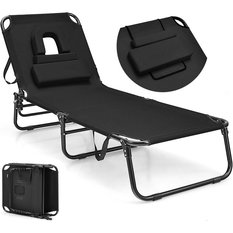 Goplus - Chaise Longue Pliante Réglable en 5 Positions-Transat Jardin avec Trou pour Visage&3 Coussins Amovibles-Charge 160KG Noir